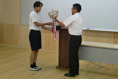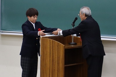 同窓会入会式が行われ、同窓会長より3年生の代表生徒が同窓会幹事の委嘱を受けました。また、3年生の代表生徒がスポーツ賞、文化賞の表彰をいただき、お祝いの言葉をいただきました。PTA会長からは3年生の代表生徒が卒業記念品をいただき、お祝いの言葉をいただきました。