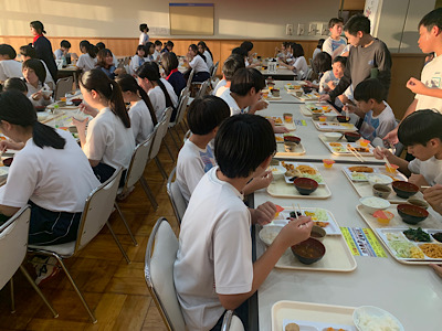 愛知県教育委員会保健体育課より2名の先生をお迎えし、食育の授業や配膳室、掲示物などについてご指導いただきました。