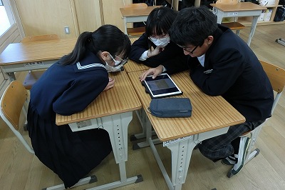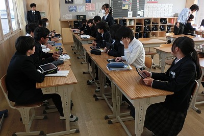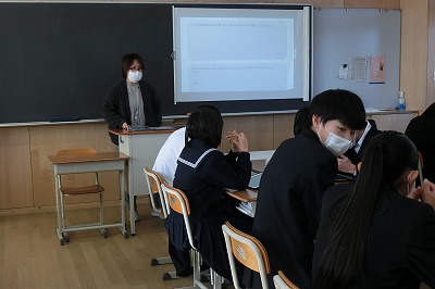 1-1社会(地理)で教育実習生による授業が行われ、生徒が日本列島に暮らす人々の起源や生活の変化を調べました。